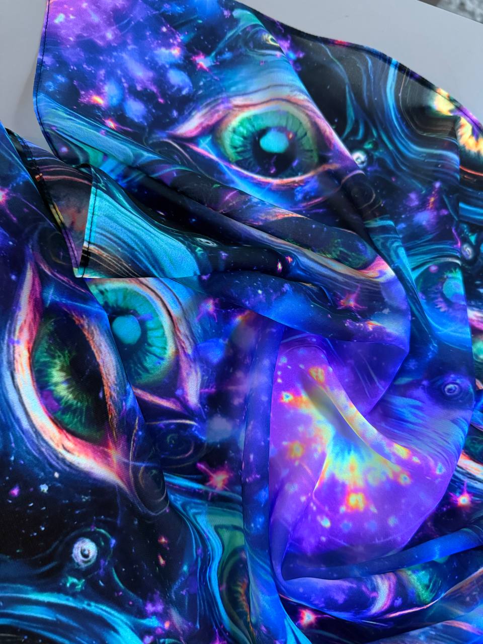 Первая платки их нежнейшего полупрозрачного шифона с моим глазастым принтом. Принт флуоресцентный (фото видео при разном свете https://t.me/amoyatoshop/446)